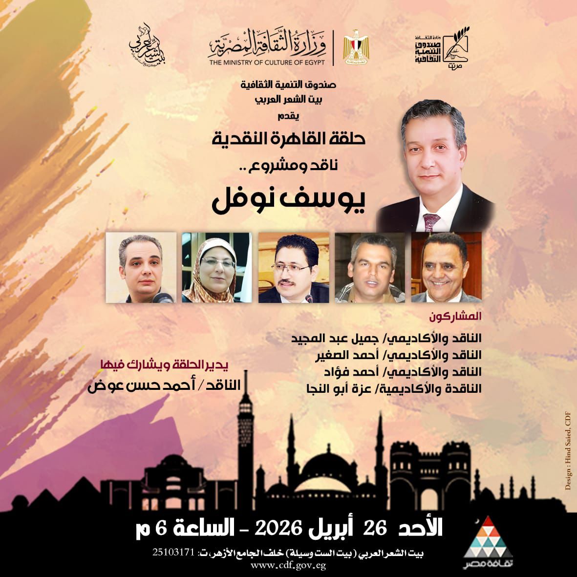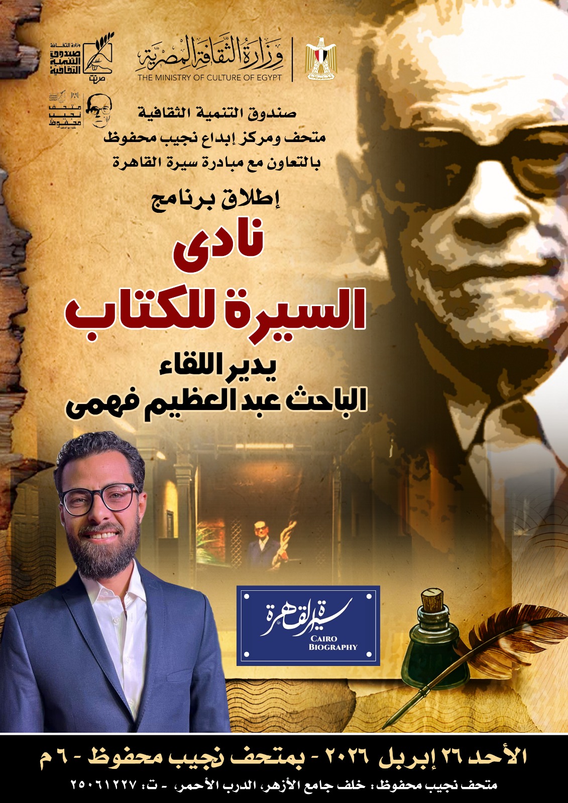 حيث تبدأ الفعاليات في الساعة الخامسة مساءً بإقامة ندوة بعنوان "آثار مصر الإسلامية" يحاضر فيها الأستاذ الدكتور جمال عبد الرحيم أستاذ الآثار والفنون الإسلامية بجامعة القاهرة.