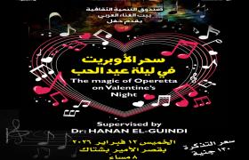 يقيم مركز إبداع قصر الأمير بشتاك بشارع المعز – التابع لصندوق التنمية الثقافية – حفل «سحر الأوبريت» في ليلة عيد الحب، وذلك يوم الخميس الموافق 12 فبراير، في تمام الساعة الثامنة مساءً، بقيادة الدكتورة حنان الجندي.