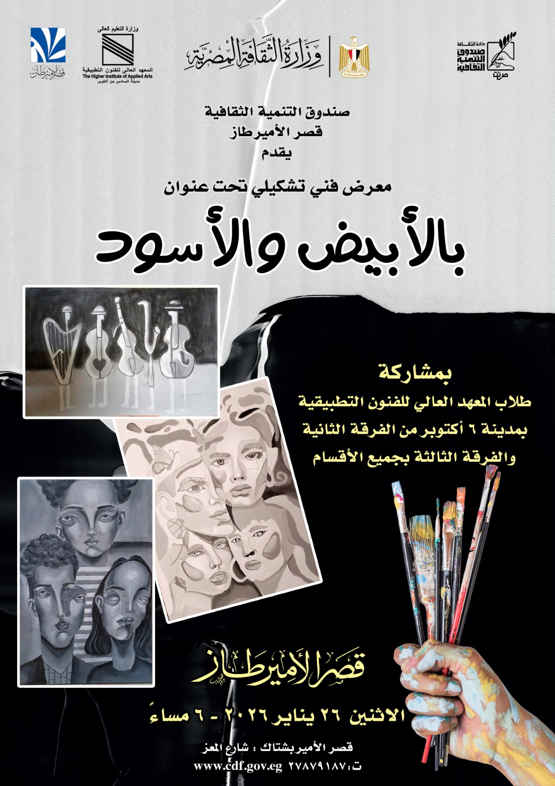 يفتتح مركز إبداع قصر الأمير طاز بالسيوفية، التابع لقطاع صندوق التنمية الثقافية، معرضًا فنيًا بعنوان «بالأبيض والأسود»، وذلك يوم الاثنين الموافق 26 يناير في تمام الساعة السادسة مساءً.