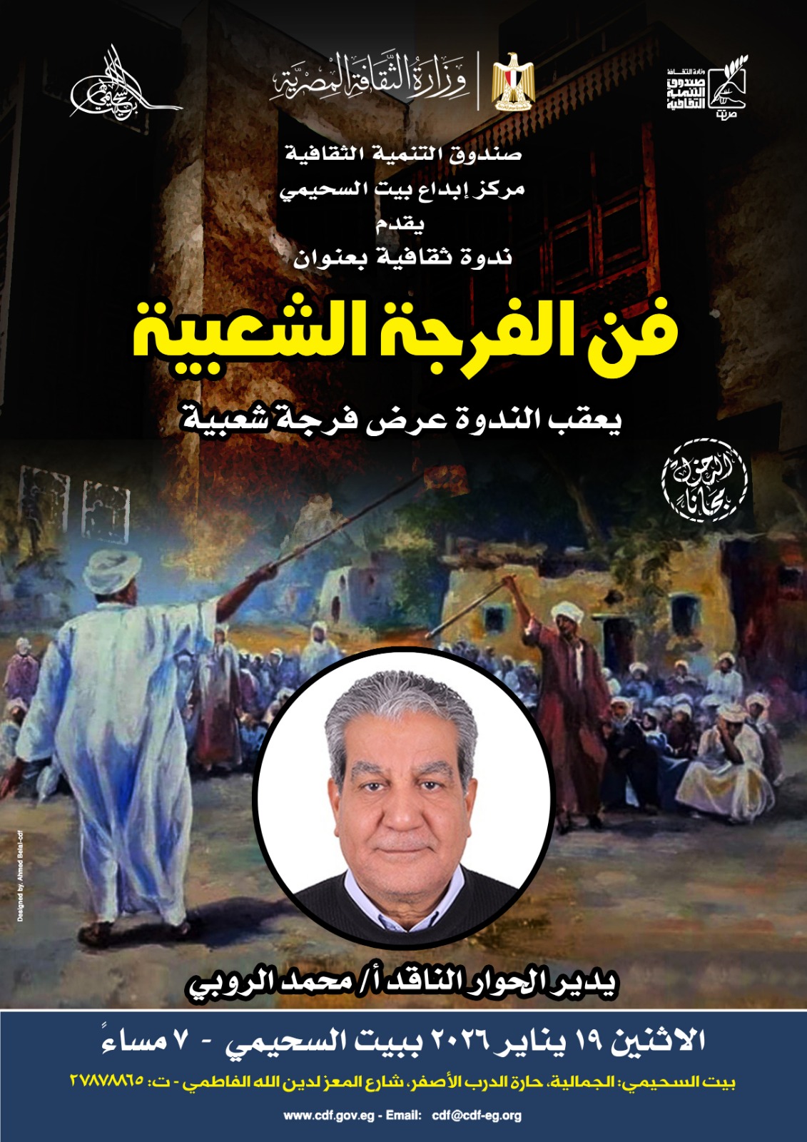يستضيف مركز إبداع بيت السحيمي بشارع المعز، التابع لقطاع صندوق التنمية الثقافية، ندوة ثقافية بعنوان «فن الفرجة الشعبية»، وذلك يوم الإثنين الموافق 19 يناير، في تمام الساعة السابعة مساءً، ويدير الندوة الناقد أ. محمد الروبي.