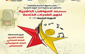 تحت رعاية وبحضور أ . د ايناس عبد الدايم وزيرة الثقافة ، تختتم في السادسة مساء الثلاثاء 19 أكتوبر علي مسرح الجمهورية، فعاليات النسخة الرابعة من مسابقة " المواهب الذهبية" لذوي الهمم، والتي نظمها قطاع صندوق التنمية الثقافية بالتعاون مع جمعية البلد اليوم .