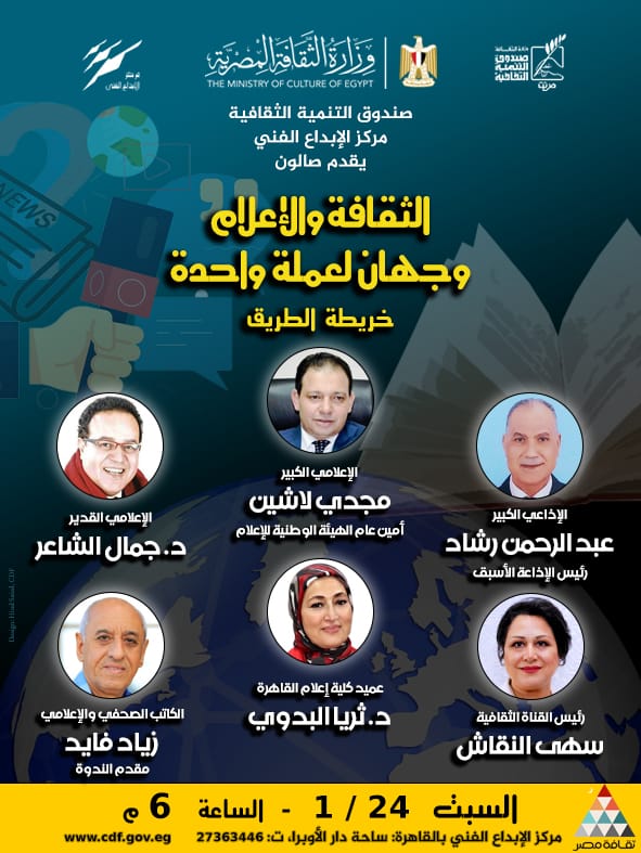 يستضيف مركز الإبداع الفني بساحة دار الأوبرا المصرية – التابع لصندوق التنمية الثقافية – ندوة الصالون الثقافي بعنوان «الثقافة والإعلام وجهان لعملة واحدة.. خريطة الطريق»، وذلك يوم السبت الموافق 24 يناير في تمام الساعة السادسة مساءً.