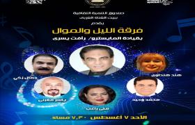 يقيم مركز ابداع بيت الغناء العربي " بقصر الأمير بشتاك " بشارع المعز، التايع لقطاع صندوق التنمية الثقافية، في السابعة مساء الأحد 7 أغسطس ، حفل فرقة الليل والموال ، بقيادة المايسترو رأفت يسري.