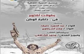 يقيم مركز طلعت حرب الثقافي (بالسيدة نفيسة)، التابع لقطاع صندوق التنمية الثقافية برئاسة الدكتورة نيفين الكيلاني، صالونه الثقافي بعنوان "بطولات أكتوبر في ذاكرة الوطن"، بمناسبة احتفالات صندوق التنمية الثقافية بالذكري الـ 43 لحرب أكتوبر المجيدة، ويدير الصالون الكاتب الصحفي والإعلامي محمد الشافعي، وذلك في السادسة من مساء السبت 8 أكتوبر بمقر المركز.