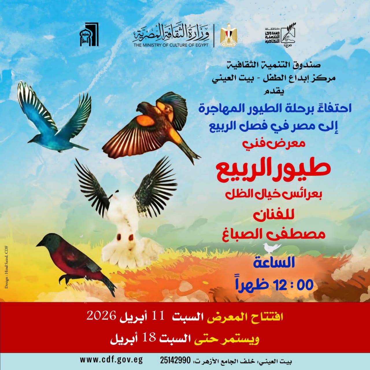 كما ينطلق في اليوم نفسه معرض «طيور الربيع» للفنان مصطفى الصباغ، ويستمر حتى 18 أبريل، مقدمًا تجربة بصرية بفن خيال الظل تستلهم ظاهرة هجرة الطيور إلى مصر، بما تحمله من دلالات بيئية وإنسانية، وتبرز في الوقت ذاته تنوع البيئات الطبيعية المصرية، ومكانة مصر كإحدى أهم محطات الهجرة عالميًا.