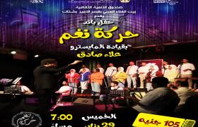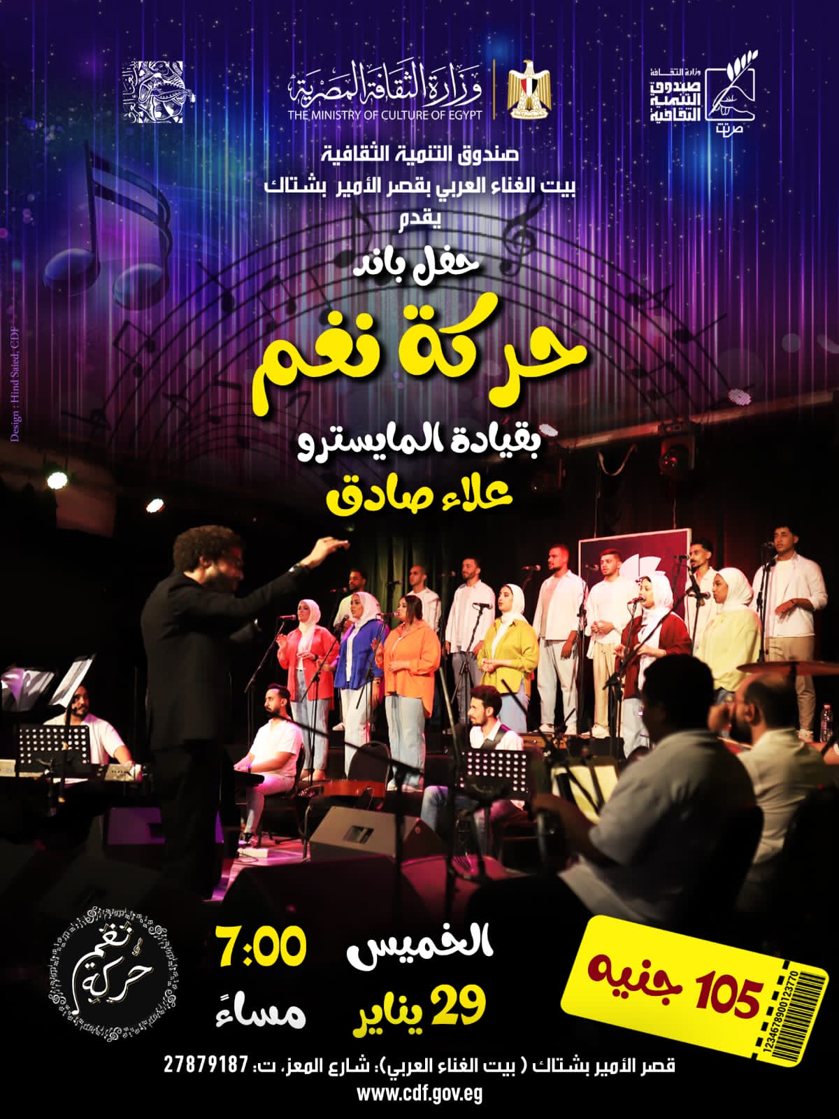 يستضيف بيت الغناء العربي بقصر الأمير بشتاك، التابع لصندوق التنمية الثقافية، حفل فرقة «باند حركة نغم» بقيادة المايسترو علاء صادق، وذلك في تمام الساعة السابعة مساء يوم الخميس الموافق 29 يناير.
