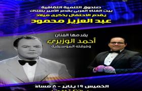 بمناسبة ذكرى ميلاد الفنان الكبير عبد العزيز محمود، يقيم بيت الغناء العربي "قصر الأمير بشتاك"، التابع لقطاع صندوق التنمية الثقافية، حفل غنائي يقدمه الفنان أحمد الوزيري وفرقته الموسيقية، وذلك في الثامنة مساء الخميس 19 يناير 2023.