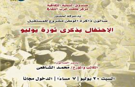 بمناسبة الإحتفال بذكري ثورة 23 يوليو ، يقيم مركز طلعت حرب الثقافى" بالسيدة نفيسة" التابع لقطاع صندوق التنمية الثقافية في السابعة مساء السبت 20 يوليو ، صالون "ذاكرة الوطن.. مشروع للمستقبل".