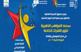 يقيم قطاع صندوق التنمية الثقافة ، بالتعاون مع جمعية " البلد اليوم" للتنمية الاقتصادية والإجتماعية ، حفل إعلان جوائز الدورة الثانية لمسابقة " المواهب الذهبية" لذوى القدارت الخاصة، وذلك فى السادسة مساء الأربعاء (٢٣ أكتوبر) بمسرح الجمهورية