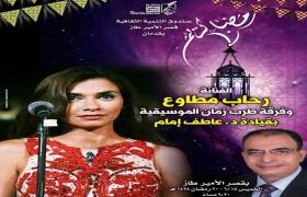 تحت عنوان الإبداع في مواجهه الإرهاب، ينظم قطاع صندوق التنمية الثقافية برئاسة الدكتور أحمد عواض، عددا من الفعاليات الفنية والثقافية، في إطار إحتفالات قطاع الصندوق بشهر رمضان الكريم، يقام حفل الفنانة رحاب مطاوع وأمسية شعرية لعدد من الشعراء، وذلك الخميس 15 يونيو الموافق 20 رمضان، في التاسعة والنصف مساء، بقصر الأمير طاز بالخليفة.
