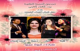 يقيم " بيت الغناء العربي " بقصر الأمير بشتاك – بشارع المعز – التابع لقطاع صندوق التنمية الثقافية في الثامنة مساء الخميس 19 ابريل ضمن البرنامج الشهري الذي يقيمه بيت الغناء لإستضافة شباب الموهبيين في مجال الغناء حيث يقدم الفنانين "هبة همت" ، "ميار سامي" ، " حبيبة " والفنان " أحمد صبري " ، يتضمن برنامج الحفل مجموعة من أجمل أغنيات زمن الفن الجميل منها " مستنياك " ، " وحشتني " ، " اكدب عليك " ، " سهر الليالي " ، " عيون القلب " ، " امتي الزمان " .