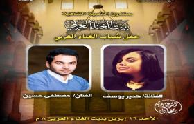 يقيم بيت الغناء العربي" بقصر الأمير باشتاك"، التابع لقطاع صندوق التنمية الثقافية برئاسة الدكتور أحمد عواض، حفل شباب الغناء العربي، للمطربة هدير يوسف، والمطرب مصطفي حسين، وذلك في الثامنة من مساء الأحد 16 ابريل .