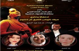 يقيم مركز ابداع بيت الغناء العربي " بقصر الأمير بشتاك" بشارع المعز، التابع لقطاع صندوق التنمية الثقافية، في السابعة مساء الخميس 30 ديسمبر، حفله الشهري لدعم الموهوبين من الأصوات الذهبية، التي فازت علي مدار الدورات الخمس السابقة من مسابقة الصوت الذهبي التي ينظمها قطاع الصندوق، ويحمل حفل هذا الشهر عنوان "كلثوميات" .