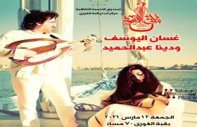يقيم مركز ابداع قبة الغوري " بشارع الأزهر" ، التابع لقطاع صندوق التنمية الثقافية ، في السابعة مساء الجمعة 12 مارس، حفل ثنائي العود غسان اليوسف و دينا عبد الحميد ، بعنوان " رحلة السلام"، مع الإلتزام بالإجراءات الوقائية .
