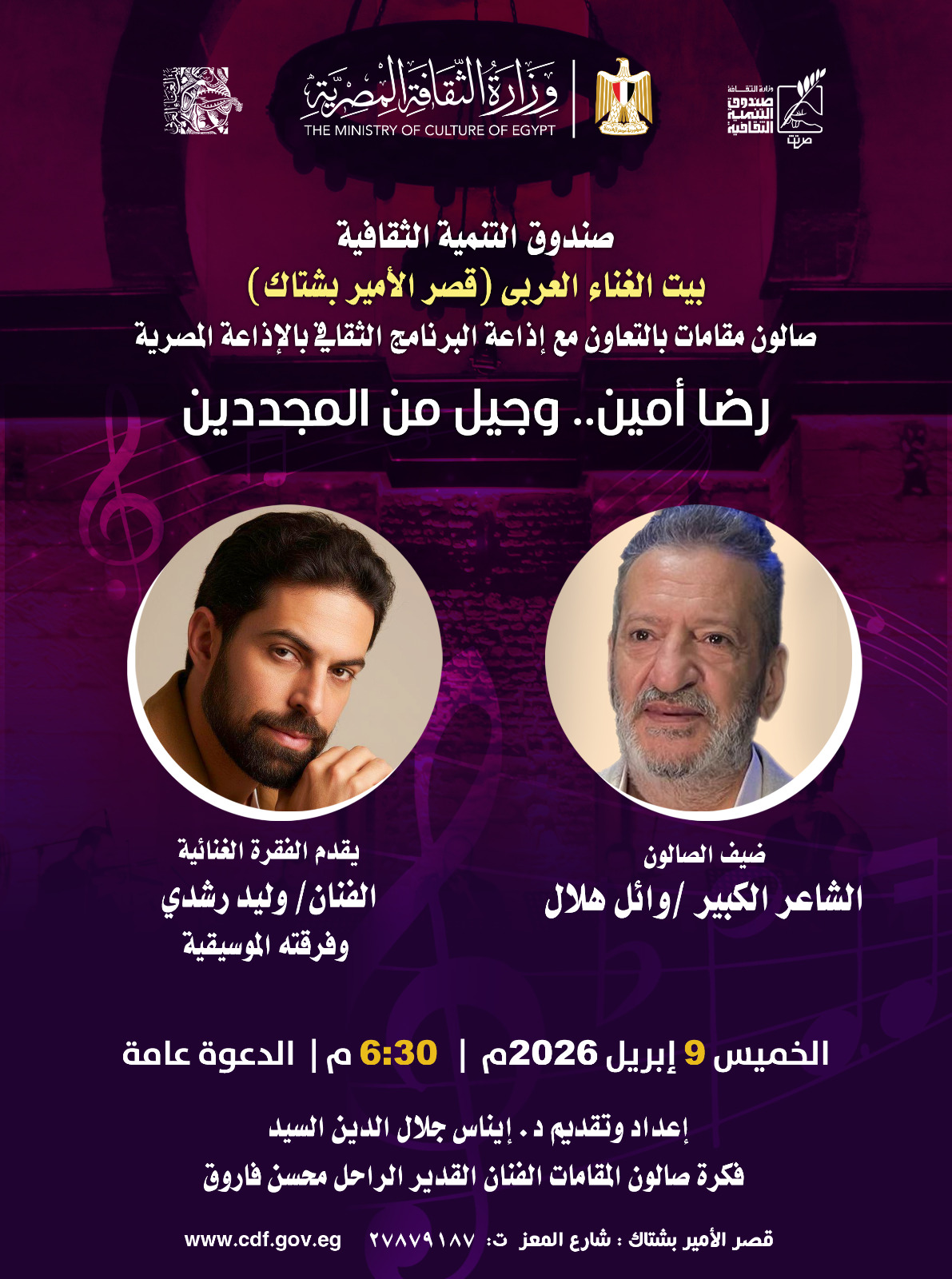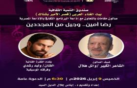 يقيم مركز إبداع بيت الغناء العربي (قصر الأمير بشتاك) بشارع المعز، التابع لقطاع صندوق التنمية الثقافية، صالون "مقامات" بالتعاون مع إذاعة البرنامج الثقافي بالإذاعة المصرية، تحت عنوان "رضا أمين.. وجيل من المجددين"، وذلك يوم الخميس 9 أبريل في تمام الساعة السادسة والنصف مساءً.