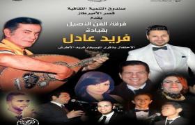 والحفل يقام بالتعاون مع جمعية محبي الموسيقار فريد الأطرش برئاسة الفنان عادل السيد، ويقود فرقة الفن الأصيل الموسيقار فريد عادل، وتقدم باقة من أجمل أغاني فريد الأطرش وهي معزوف توته، نورا نورا غناء محمد سليم، الحياة حلوة غناء مصطفي راضي، أحبابنا يا عين ويا دلع دلع غناء زينب المصري، هلت ليالي غناء إبراهيم عبد المنعم، نجوم الليل غناء محمد العجمي، حبايبي يا غايبين و علشان ماليش غيرك غناء محمد وحيد، مانحرمش العمر منك و جري إية يا عزالنا غناء مريم محمد، لحن الخلود وبنادي عليك غناء محمود درويش، ويختتم الحفل بأغنية يا بلادي أداء فريد عادل ومريم محمد