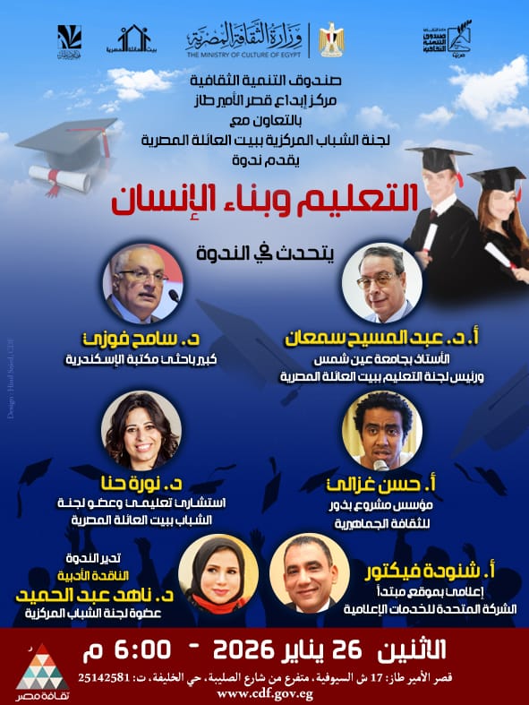 يستضيف مركز إبداع الأمير طاز- التابع لصندوق التنمية الثقافية لجنة الشباب المركزية ببيت العائلة المصرية وتقدم ندوة تحت عنوان "التعليم وبناء الإنسان" وذلك في تمام الساعة السادسة مساء يوم الاثنين الموافق ٢٦ يناير ٢٠٢٦ .
