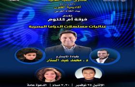 يقيم قطاع صندوق التنمية الثقافية بالتعاون مع أكاديمية الفنون في السابعة والنصف مساء الإثنين القادم 25 نوفمبر حفل فرقة "أم كلثوم" التابعة للمعهد العالى للموسيقى العربية ببيت الغناء العربي " بقصر الأمير بشتاك" بشارع المعز.