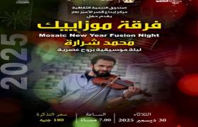 يستضيف مركز إبداع قصر الأمير طاز بشارع السيوفية، التابع لقطاع صندوق التنمية الثقافية، مساء الثلاثاء 30 ديسمبر، حفلاً موسيقيًا جديدًا لفرقة «موزاييك» بقيادة عازف الكمان محمد شرارة، وذلك في تمام الساعة السابعة مساءً.