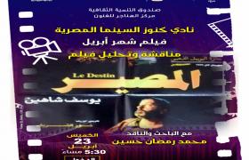 يستضيف مركز إبداع سينما الهناجر بساحة دار الأوبرا المصرية، في الخامسة والنصف مساء الخميس 23 أبريل، لقاءً جديدًا لنادي كنوز السينما المصرية، لمناقشة وتحليل فيلم “المصير” للمخرج يوسف شاهين، بمشاركة عدد من صُنّاع الفيلم.