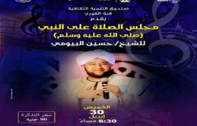 ينظم مركز إبداع قبة الغوري بشارع الأزهر، التابع لقطاع صندوق التنمية الثقافية، حفلاً للشيخ حسين البيومي بعنوان "مجلس الصلاة على النبي، وذلك في تمام الساعة السادسة والنصف مساء يوم الخميس الموافق 30 أبريل.