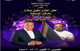 يقيم بيت الغناء العربي بقصر الأمير بشتاك " بشارع المعز "، التابع لقطاع صندوق التنمية الثقافية، في السابعة مساء الخميس 21 أكتوبر، حفل غنائي للفنان محي صلاح وفرقته الموسيقية .