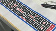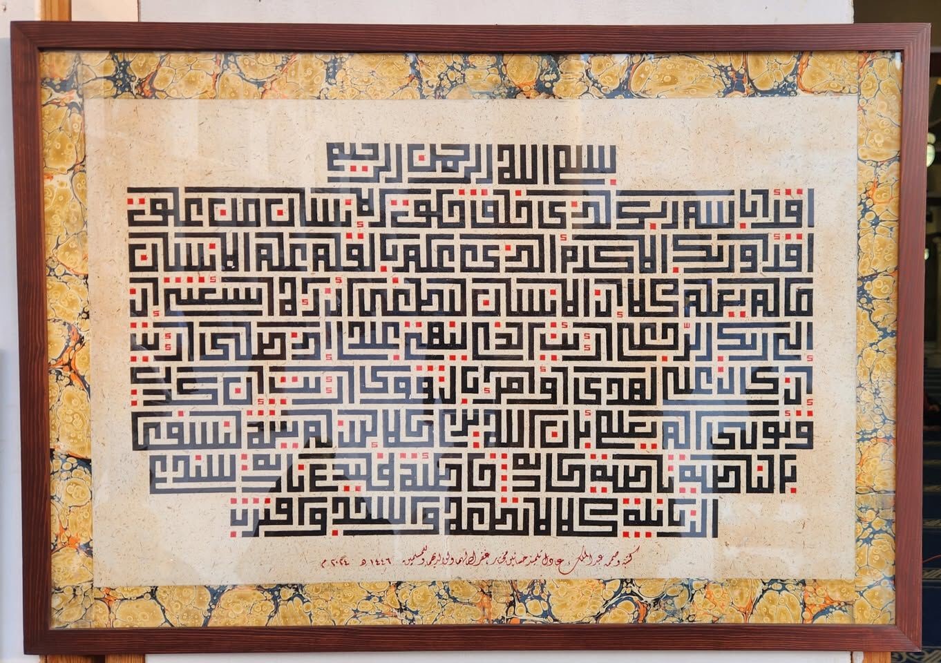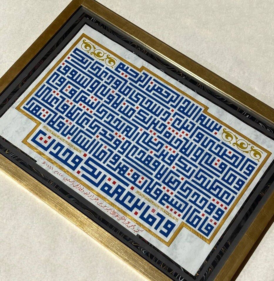 العمل الأول: عمل كلاسيكي بالكوفي المربع سورة العلق منفذ على ورق مقهر وإخراج ابرو مساحة العمل 100*70