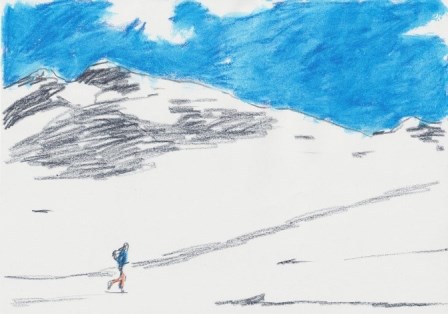 An artist sets up his equipment at La Pilatte in the Oisans massif to paint a portrait of its glacier. In reality, he's going to paint the portrait of Angelo, an imaginary mountaineer.