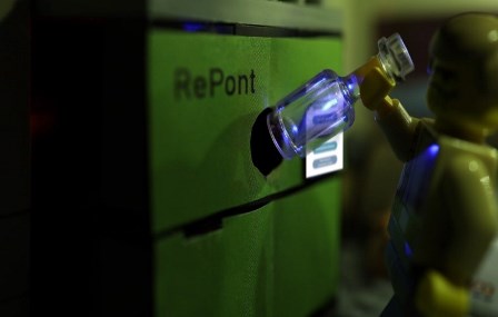 رجلٌ ينوي استبدال الزجاجات القابلةلإعادة التدوير،لكن الآلة لاتعمل بشكل جيد.
